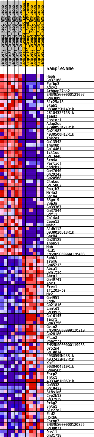Heat Map of the top 50 features for each phenotype in GMP.GMP.mono_Pheno.cls#Group3_versus_Group4