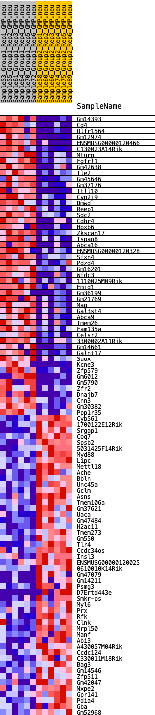 Heat Map of the top 50 features for each phenotype in GMP.GMP.neu_Pheno.cls#Group1_versus_Group2