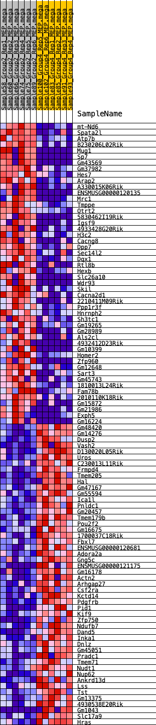 Heat Map of the top 50 features for each phenotype in MEP.MEP.mega_Pheno.cls#Group2_versus_Group4